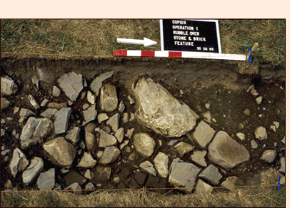 We began testing in the western end of this area and worked our way east but it was not long before we realized that what a number of local people had told us was true - much of the land within our survey area was man-made and had been built up over wet ground so that people could construct their houses. This meant that most of our survey area would have been total unsuitable for settlement when Guy's party arrived. However, there was one exception. At the eastern end was a dry, level terrace that rose about four metres above the low ground to the west.