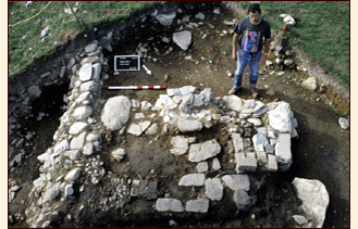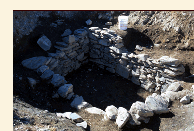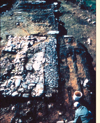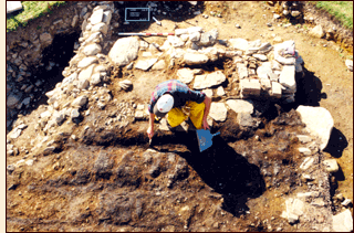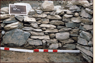 Twenty-two feet (6.70 m) west of the northern half of Structure 1 we uncovered part of a fourth building (Structure 5). Here the remains of a stone wall measuring eight feet (2.44 m) long and three feet (0.91 m) wide runs north to south and almost parallel to Structure 1. Unfortunately, only the lower courses of this wall have survived and it seems clear that much of the original stone was removed in the late eighteenth or early in the nineteenth-century. Two post holes located on the western side of the wall, one at the northwest corner and the other at the southwest corner, suggest that it once formed the eastern end of a building, probably with wooden side walls, that extended for an as yet unknown distance farther west.