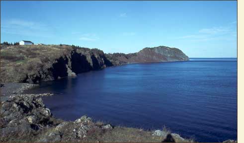 Henry Crout and three other colonists from Cupers Cove returned to the bottom of Trinity Bay aboard a shallop. There were two reasons for their voyage: one was to determine if the red stone they had seen in the cliffs around Spread Eagle and Chapel Arm in the fall of 1612 was iron ore; the other was to contact the Beothuk they had met the previous year. On July 1 they arrived in the vicinity of Chapel Arm where they examined the stone and soon discovered that it was not iron ore but red shale. The next morning they sailed east into Dildo Arm and on one of the islands at the entrance to the arm they saw a Beothuk house. Going ashore, they found that the house was deserted and Crout assumed that its inhabitants had “newly gone from their house into the woods”. Crout left presents at the house and continued on to the bottom of the arm. The next morning, on their way out the arm, they found that the Indians had gone from the island but had left behind “spits of their roast meat”. This Crout took to be a gift left in exchange for the presents he had placed there the previous day.