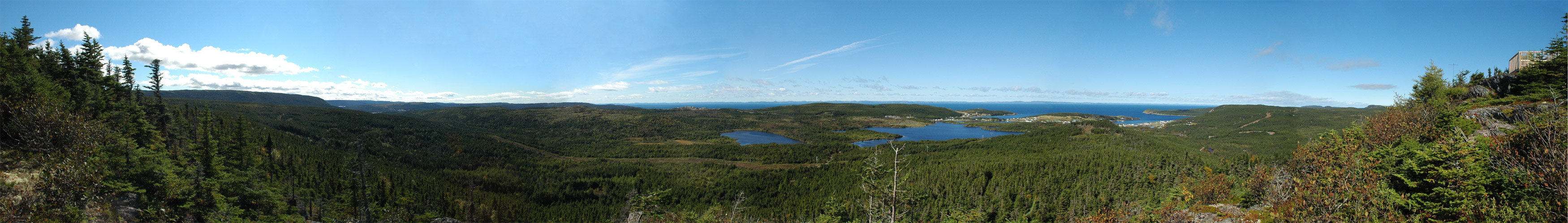 This panorama shows New Perlican and the surrounding area from the hill called the "Tote". It goes from southeast through west to northeast. To the south is the ridge just west of Heart's Content known as the Mizzen; to the west are Vitter's Cove and New Perlican. The Sugar Loaf can be seen in the distance to the south just west of the observation deck.
